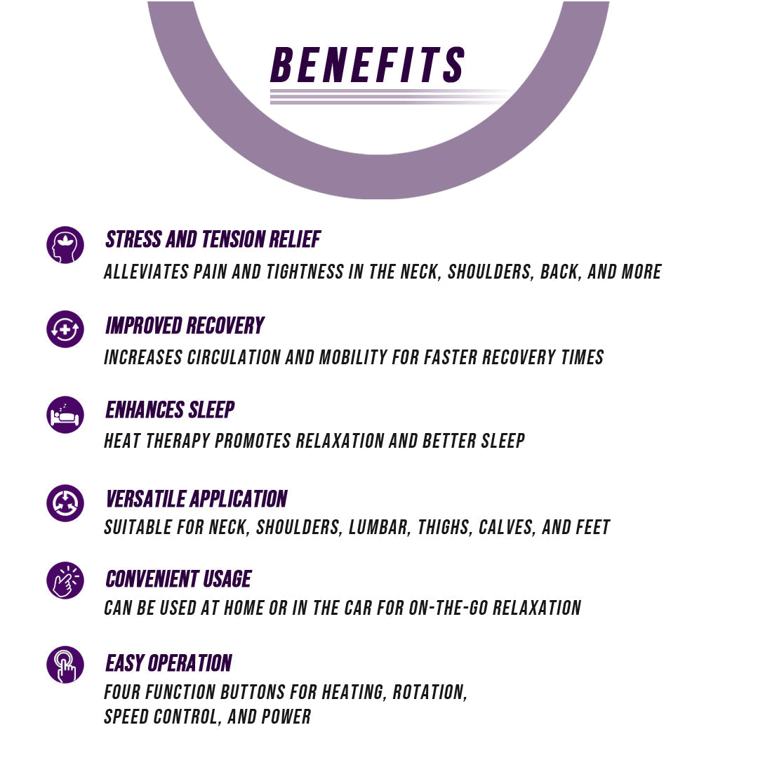 Our Shiatsu Neck Massager also features infrared heat therapy, which helps to warm up your muscles and enhance blood flow. With a powerful motor reaching speeds of up to 3000 RPM, this massager delivers a deep tissue massage that promotes relaxation and reduces tightness.